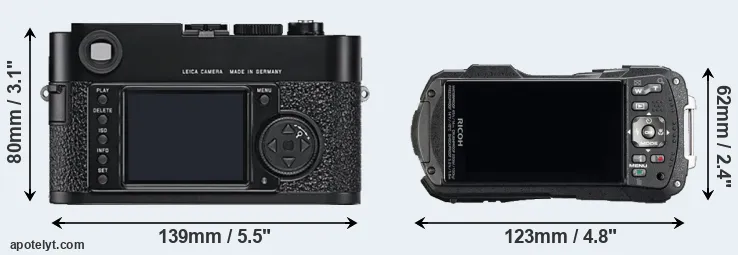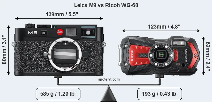 The physical size and weight of the Leica M9 and the Ricoh WG-60 are illustrated in the side-by-side display below. The two cameras are presented according to their relative size. Three successive views from the front, the top, and the rear are shown. All width, height and depth measures are rounded to the nearest millimeter.