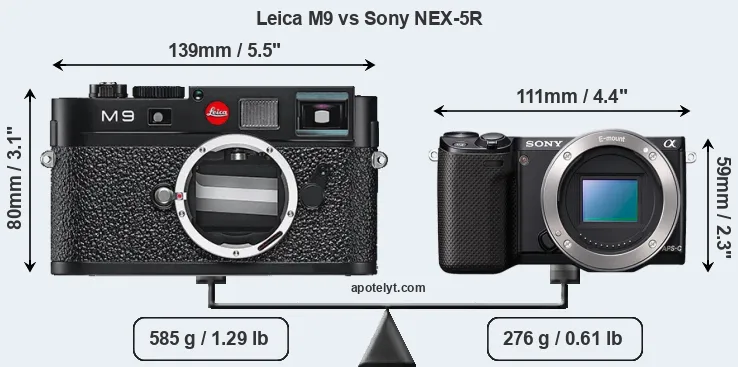 If the front view area (width x height) of the cameras is taken as an aggregate measure of their size, the Sony NEX-5R is considerably smaller (41 percent) than the Leica M9. Moreover, the NEX-5R is substantially lighter (53 percent) than the M9. In this context, it is worth noting that neither the M9 nor the NEX-5R are weather-sealed.