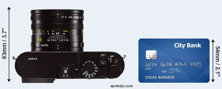 The physical dimensions of the Leica Q Typ 116 relative to a credit card are illustrated in the side-by-side display below. Three consecutive views from the front, the top, and the rear side are shown. All width, height and depth measures are rounded to the nearest millimeter.