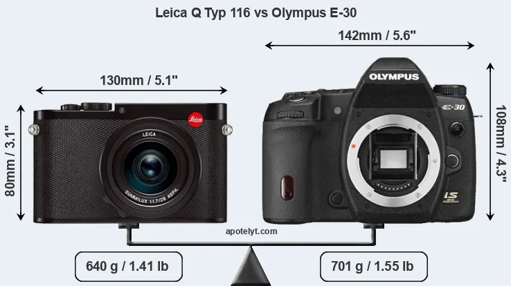 An illustration of the physical size and weight of the Leica Q Typ 116 and the Olympus E-30 is provided in the side-by-side display below. The two cameras are presented according to their relative size. Three successive views from the front, the top, and the rear are shown. All width, height and depth dimensions are rounded to the nearest millimeter.