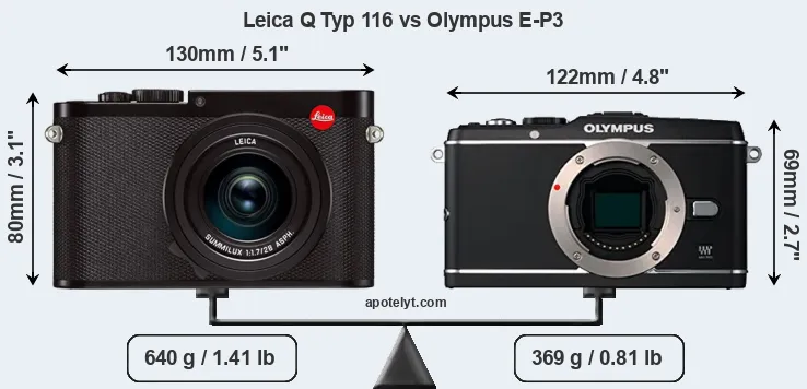 The physical size and weight of the Leica Q Typ 116 and the Olympus E-P3 are illustrated in the side-by-side display below. The two cameras are presented according to their relative size. Three consecutive perspectives from the front, the top, and the back are available. All width, height and depth dimensions are rounded to the nearest millimeter.