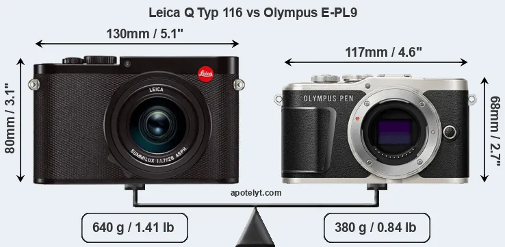 If the front view area (width x height) of the cameras is taken as an aggregate measure of their size, the Olympus E-PL9 is notably smaller (23 percent) than the Leica Q Typ 116. In this context, it is worth noting that neither the Q Typ 116 nor the E-PL9 are weather-sealed.