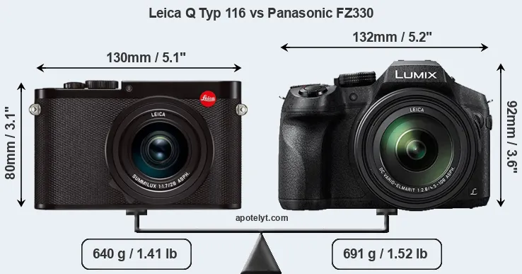 If the front view area (width x height) of the cameras is taken as an aggregate measure of their size, the Panasonic FZ330 is notably larger (17 percent) than the Leica Q Typ 116. Moreover, the FZ330 is markedly heavier (8 percent) than the Q Typ 116. It is noteworthy in this context that the FZ330 is splash and dust-proof, while the Q Typ 116 does not feature any corresponding weather-sealing.