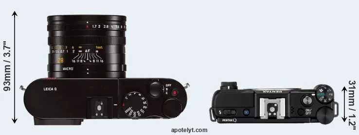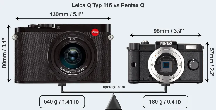 If the front view area (width x height) of the cameras is taken as an aggregate measure of their size, the Pentax Q is considerably smaller (46 percent) than the Leica Q Typ 116. In this context, it is worth noting that neither the Q Typ 116 nor the Pentax Q are weather-sealed.