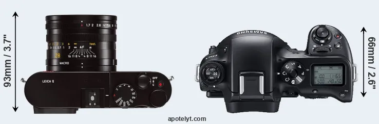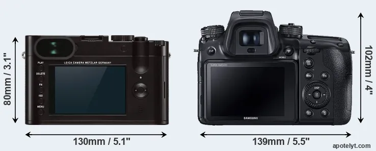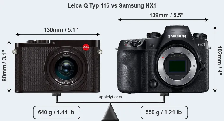 The physical size and weight of the Leica Q Typ 116 and the Samsung NX1 are illustrated in the side-by-side display below. The two cameras are presented according to their relative size. Three successive views from the front, the top, and the rear are shown. All width, height and depth dimensions are rounded to the nearest millimeter.
