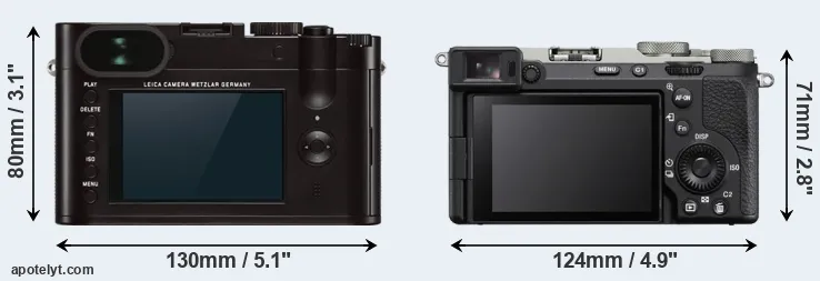 If the front view area (width x height) of the cameras is taken as an aggregate measure of their size, the Sony A7C II is notably smaller (15 percent) than the Leica Q Typ 116. It is noteworthy in this context that the A7C II is splash and dust-proof, while the Q Typ 116 does not feature any corresponding weather-sealing.