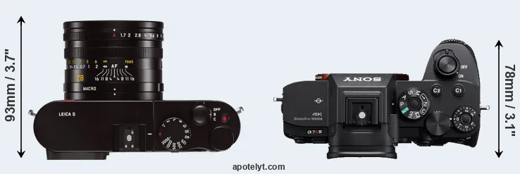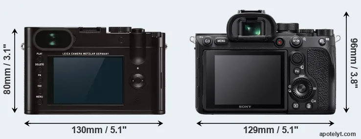 If the front view area (width x height) of the cameras is taken as an aggregate measure of their size, the Sony A7R IV is notably larger (19 percent) than the Leica Q Typ 116. It is noteworthy in this context that the A7R IV is splash and dust-proof, while the Q Typ 116 does not feature any corresponding weather-sealing.