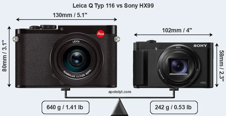 If the front view area (width x height) of the cameras is taken as an aggregate measure of their size, the Sony HX99 is considerably smaller (43 percent) than the Leica Q Typ 116. Moreover, the HX99 is substantially lighter (62 percent) than the Q Typ 116. In this context, it is worth noting that neither the Q Typ 116 nor the HX99 are weather-sealed.