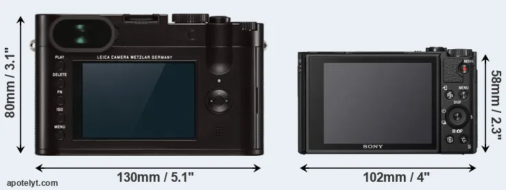 The side-by-side display below illustrates the physical size and weight of the Leica Q Typ 116 and the Sony HX99. The two cameras are presented according to their relative size. Three consecutive perspectives from the front, the top, and the back are available. All width, height and depth measures are rounded to the nearest millimeter.