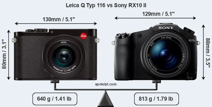 If the front view area (width x height) of the cameras is taken as an aggregate measure of their size, the Sony RX10 II is notably larger (9 percent) than the Leica Q Typ 116. Moreover, the RX10 II is markedly heavier (27 percent) than the Q Typ 116. It is noteworthy in this context that the RX10 II is splash and dust-proof, while the Q Typ 116 does not feature any corresponding weather-sealing.