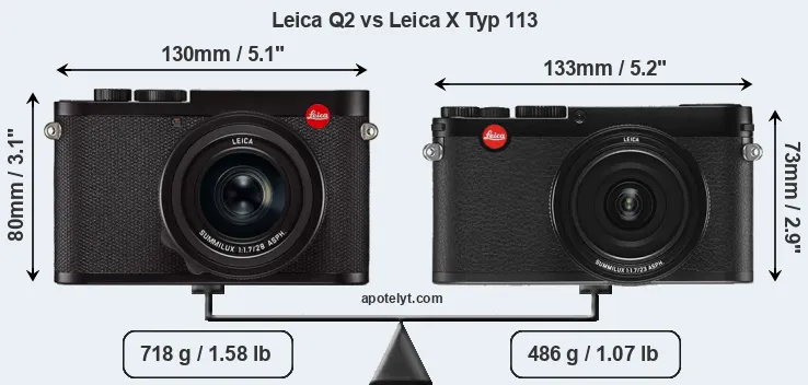 If the front view area (width x height) of the cameras is taken as an aggregate measure of their size, the Leica X Typ 113 is notably smaller (7 percent) than the Leica Q2. Moreover, the X Typ 113 is markedly lighter (32 percent) than the Q2. It is worth mentioning in this context that the Q2 is splash and dust resistant, while the X Typ 113 does not feature any corresponding weather-sealing.