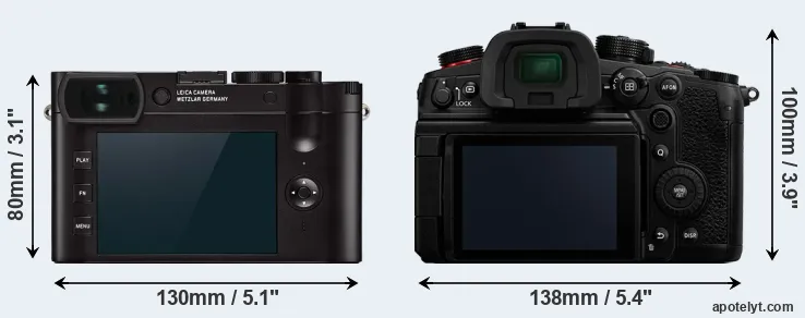 If the front view area (width x height) of the cameras is taken as an aggregate measure of their size, the Panasonic GH6 is notably larger (33 percent) than the Leica Q2. In this context, it is worth noting that both cameras are splash and dust-proof and can, hence, be used in inclement weather conditions or harsh environments.