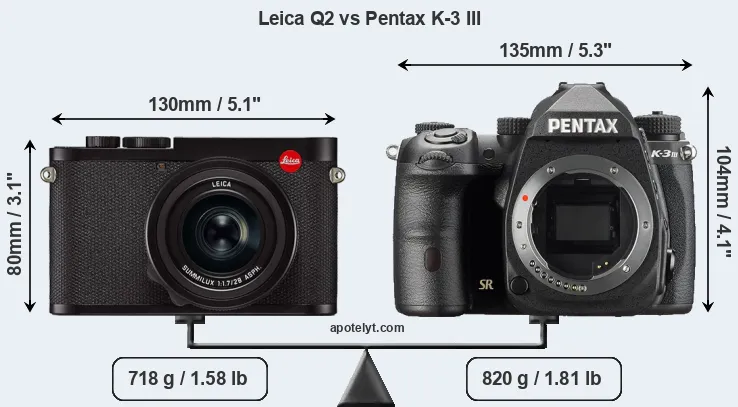 An illustration of the physical size and weight of the Leica Q2 and the Pentax K-3 III is provided in the side-by-side display below. The two cameras are presented according to their relative size. Three successive views from the front, the top, and the rear are shown. All size dimensions are rounded to the nearest millimeter.