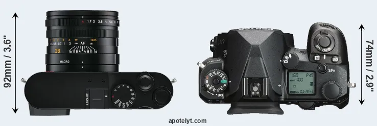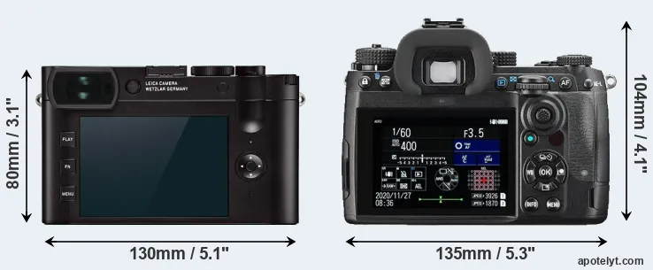 If the front view area (width x height) of the cameras is taken as an aggregate measure of their size, the Pentax K-3 III is notably larger (35 percent) than the Leica Q2. In this context, it is worth noting that both cameras are splash and dust-proof and can, hence, be used in inclement weather conditions or harsh environments.