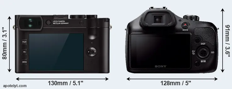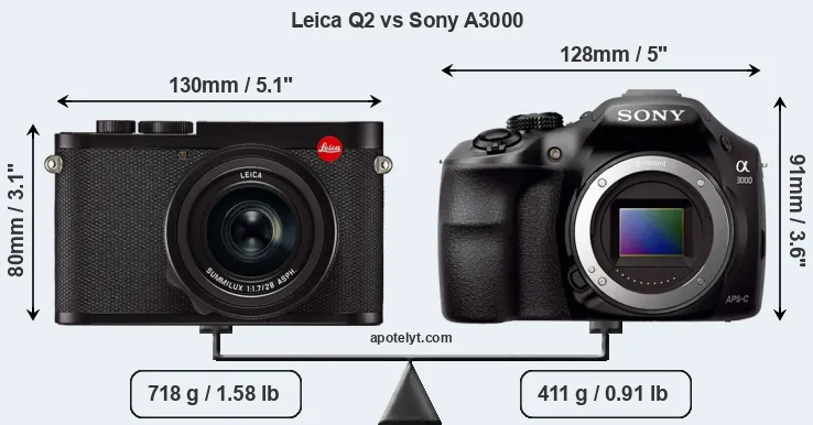 The physical size and weight of the Leica Q2 and the Sony A3000 are illustrated in the side-by-side display below. The two cameras are presented according to their relative size. Three consecutive perspectives from the front, the top, and the back are available. All width, height and depth measures are rounded to the nearest millimeter.