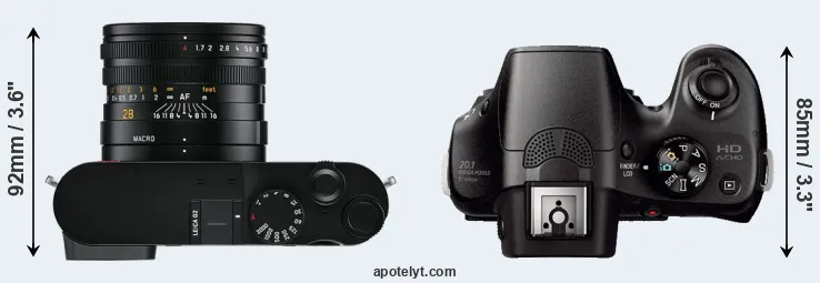 The Leica Q2 and the Sony Alpha A3000 are two digital cameras that were officially introduced, respectively, in March 2019 and August 2013. The Q2 is a fixed lens compact, while the A3000 is a mirrorless interchangeable lens camera. The cameras are based on a full frame (Q2) and an APS-C (A3000) sensor. The Leica has a resolution of 46.7 megapixels, whereas the Sony provides 19.8 MP.
