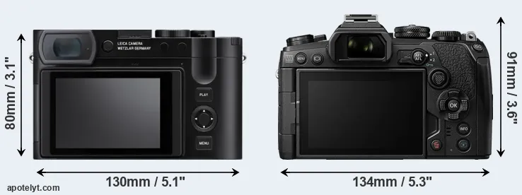 The side-by-side display below illustrates the physical size and weight of the Leica Q3 and the Olympus E-M1 III. The two cameras are presented according to their relative size. Three consecutive perspectives from the front, the top, and the back are available. All width, height and depth dimensions are rounded to the nearest millimeter.