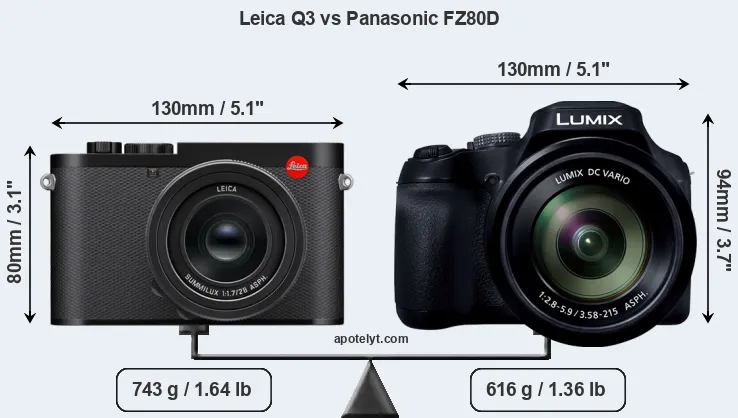 The Leica Q3 and the Panasonic Lumix DC-FZ80D (labelled Panasonic FZ82D in some countries) are two digital cameras that were revealed to the public, respectively, in May 2023 and July 2024. Both the Q3 and the FZ80D are fixed lens compact cameras that are based on a full frame (Q3) and a 1/2.3-inch (FZ80D) sensor. The Leica has a resolution of 60.3 megapixels, whereas the Panasonic provides 18 MP.