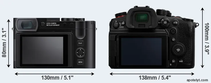 If the front view area (width x height) of the cameras is taken as an aggregate measure of their size, the Panasonic GH6 is notably larger (33 percent) than the Leica Q3. In this context, it is worth noting that both cameras are splash and dust-proof and can, hence, be used in inclement weather conditions or harsh environments.