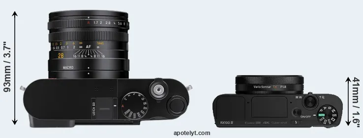 The physical size and weight of the Leica Q3 and the Sony RX100 IV are illustrated in the side-by-side display below. The two cameras are presented according to their relative size. Three successive views from the front, the top, and the rear are shown. All width, height and depth measures are rounded to the nearest millimeter.