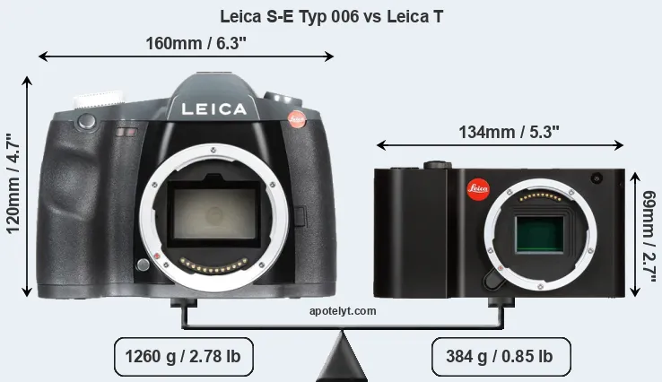 The Leica S-E (Typ 006) and the Leica T (Typ 701) are two digital cameras that were announced, respectively, in September 2014 and April 2014. The S-E Typ 006 is a DSLR, while the T Typ 701 is a mirrorless interchangeable lens camera. The cameras are based on a medium format (S-E Typ 006) and an APS-C (T Typ 701) sensor. The S-E Typ 006 has a resolution of 37.5 megapixels, whereas the T Typ 701 provides 16.2 MP.