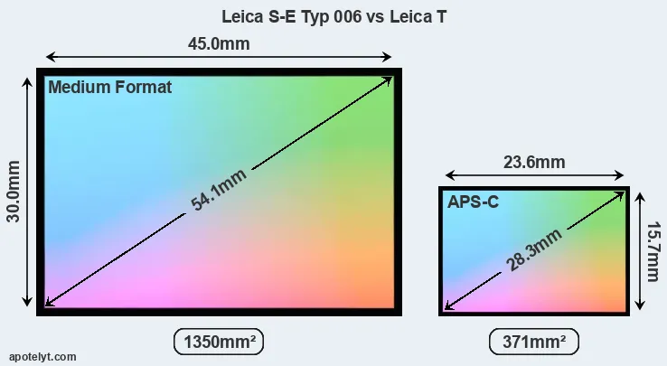 Of the two cameras under consideration, the Leica S-E Typ 006 features a medium format sensor and the Leica T an APS-C sensor. The sensor area in the T Typ 701 is 73 percent smaller. As a result of these sensor size differences, the cameras have a format factor of, respectively, 0.8 and 1.5. Both cameras have a native aspect ratio (sensor width to sensor height) of 3:2.