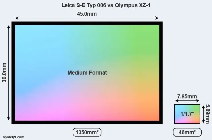 Of the two cameras under consideration, the Leica S-E Typ 006 features a medium format sensor and the Olympus XZ-1 a 1/1.7-inch sensor. The sensor area in the XZ-1 is 97 percent smaller. As a result of these sensor size differences, the cameras have a format factor of, respectively, 0.8 and 4.4. The sensor in the S-E Typ 006 has a native 3:2 aspect ratio, while the one in the XZ-1 offers a 4:3 aspect.