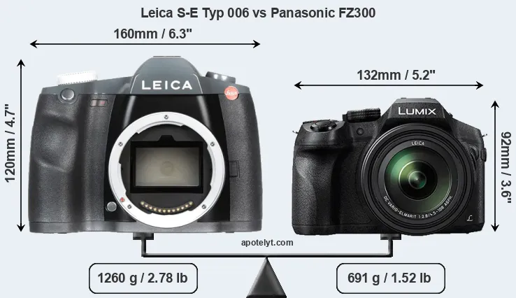 An illustration of the physical size and weight of the Leica S-E Typ 006 and the Panasonic FZ300 is provided in the side-by-side display below. The two cameras are presented according to their relative size. Three successive views from the front, the top, and the rear are shown. All width, height and depth dimensions are rounded to the nearest millimeter.