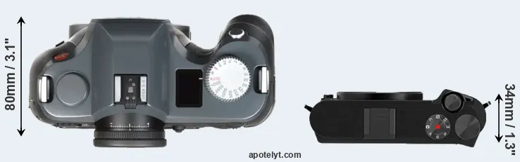 The physical size and weight of the Leica S-E Typ 006 and the YI M1 are illustrated in the side-by-side display below. The two cameras are presented according to their relative size. Three consecutive views from the front, the top, and the rear side are shown. All size dimensions are rounded to the nearest millimeter.