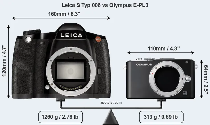 If the front view area (width x height) of the cameras is taken as an aggregate measure of their size, the Olympus E-PL3 is considerably smaller (63 percent) than the Leica S Typ 006. Moreover, the E-PL3 is substantially lighter (75 percent) than the S Typ 006. It is worth mentioning in this context that the S Typ 006 is splash and dust resistant, while the E-PL3 does not feature any corresponding weather-sealing.