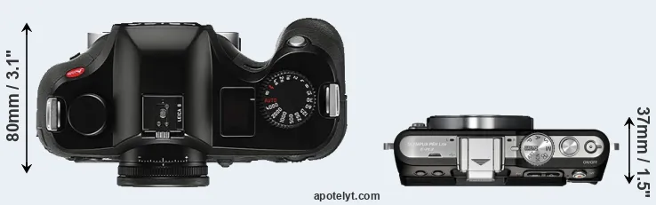 An illustration of the physical size and weight of the Leica S Typ 006 and the Olympus E-PL3 is provided in the side-by-side display below. The two cameras are presented according to their relative size. Three successive views from the front, the top, and the rear are shown. All width, height and depth dimensions are rounded to the nearest millimeter.