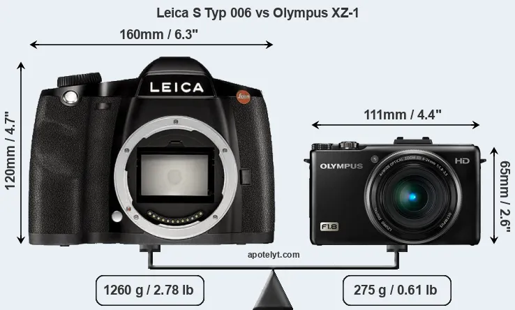 If the front view area (width x height) of the cameras is taken as an aggregate measure of their size, the Olympus XZ-1 is considerably smaller (62 percent) than the Leica S Typ 006. It is worth mentioning in this context that the S Typ 006 is splash and dust resistant, while the XZ-1 does not feature any corresponding weather-sealing.