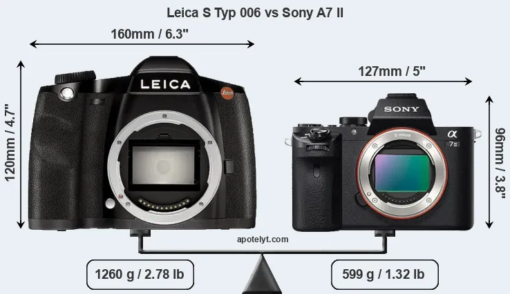 The side-by-side display below illustrates the physical size and weight of the Leica S Typ 006 and the Sony A7 II. The two cameras are presented according to their relative size. Three successive views from the front, the top, and the rear are shown. All width, height and depth measures are rounded to the nearest millimeter.