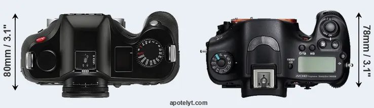 The physical size and weight of the Leica S Typ 006 and the Sony A99 are illustrated in the side-by-side display below. The two cameras are presented according to their relative size. Three consecutive perspectives from the front, the top, and the back are available. All width, height and depth dimensions are rounded to the nearest millimeter.