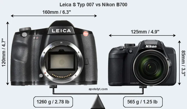 If the front view area (width x height) of the cameras is taken as an aggregate measure of their size, the Nikon B700 is considerably smaller (45 percent) than the Leica S Typ 007. It is worth mentioning in this context that the S Typ 007 is splash and dust resistant, while the B700 does not feature any corresponding weather-sealing.
