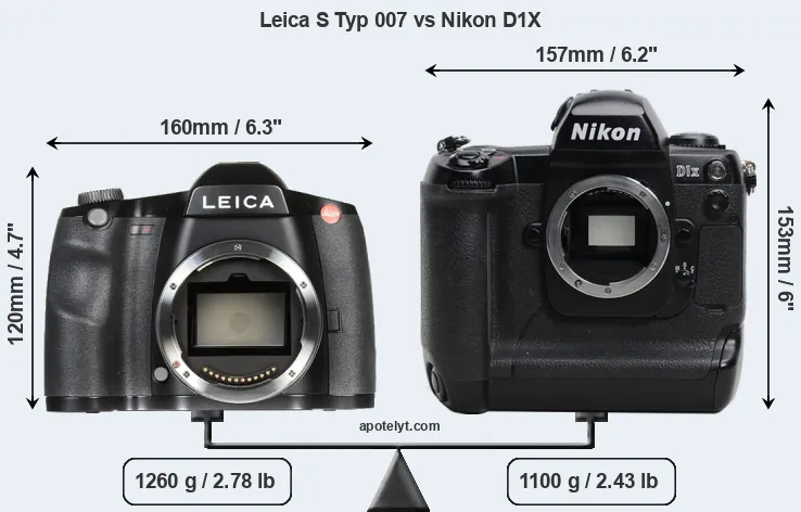 The physical size and weight of the Leica S Typ 007 and the Nikon D1X are illustrated in the side-by-side display below. The two cameras are presented according to their relative size. Three consecutive views from the front, the top, and the rear side are shown. All width, height and depth measures are rounded to the nearest millimeter.