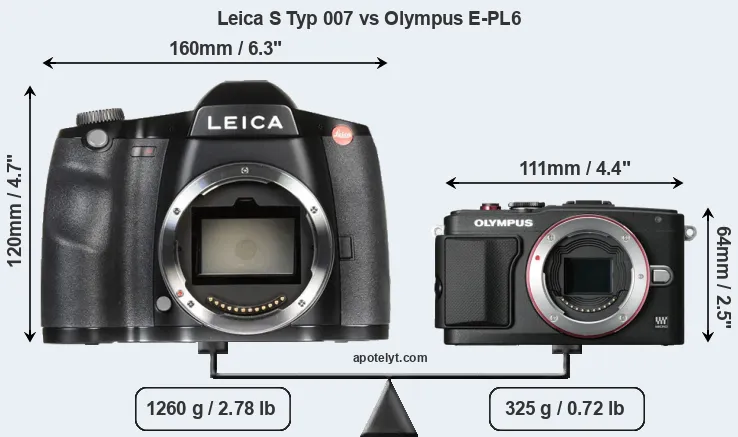 An illustration of the physical size and weight of the Leica S Typ 007 and the Olympus E-PL6 is provided in the side-by-side display below. The two cameras are presented according to their relative size. Three successive views from the front, the top, and the rear are shown. All width, height and depth dimensions are rounded to the nearest millimeter.