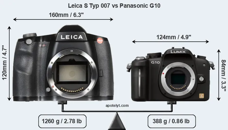 If the front view area (width x height) of the cameras is taken as an aggregate measure of their size, the Panasonic G10 is considerably smaller (46 percent) than the Leica S Typ 007. Moreover, the G10 is substantially lighter (69 percent) than the S Typ 007. It is worth mentioning in this context that the S Typ 007 is splash and dust resistant, while the G10 does not feature any corresponding weather-sealing.
