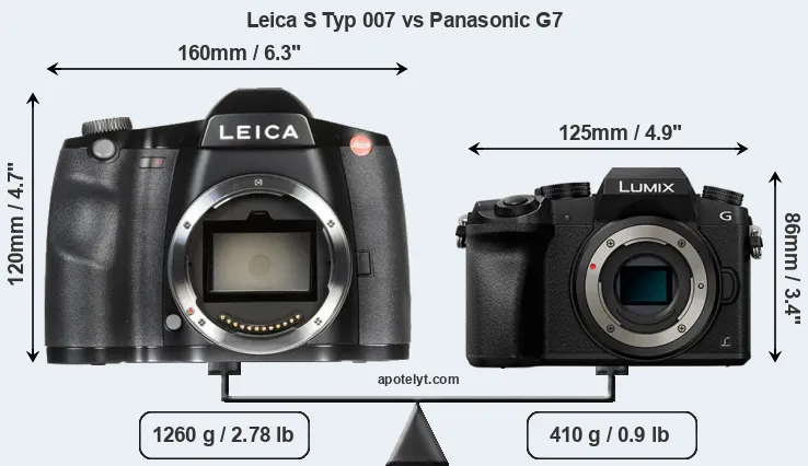 If the front view area (width x height) of the cameras is taken as an aggregate measure of their size, the Panasonic G7 is considerably smaller (44 percent) than the Leica S Typ 007. Moreover, the G7 is substantially lighter (67 percent) than the S Typ 007. It is worth mentioning in this context that the S Typ 007 is splash and dust resistant, while the G7 does not feature any corresponding weather-sealing.