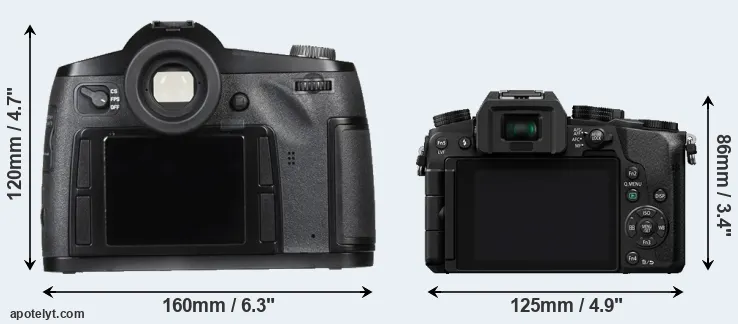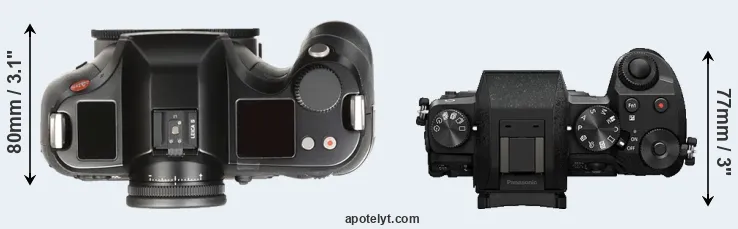 The physical size and weight of the Leica S Typ 007 and the Panasonic G7 are illustrated in the side-by-side display below. The two cameras are presented according to their relative size. Three successive views from the front, the top, and the rear are shown. All size dimensions are rounded to the nearest millimeter.