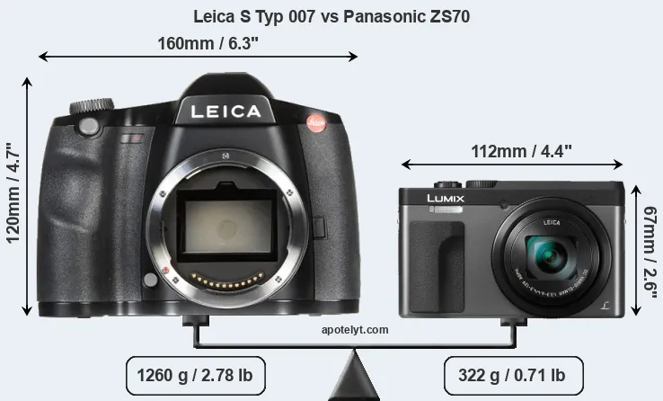 An illustration of the physical size and weight of the Leica S Typ 007 and the Panasonic ZS70 is provided in the side-by-side display below. The two cameras are presented according to their relative size. Three consecutive views from the front, the top, and the rear side are shown. All width, height and depth measures are rounded to the nearest millimeter.