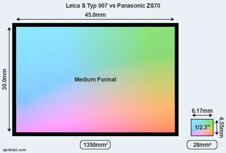 Of the two cameras under consideration, the Leica S Typ 007 features a medium format sensor and the Panasonic ZS70 a 1/2.3-inch sensor. The sensor area in the ZS70 is 98 percent smaller. As a result of these sensor size differences, the cameras have a format factor of, respectively, 0.8 and 5.6. The sensor in the S Typ 007 has a native 3:2 aspect ratio, while the one in the ZS70 offers a 4:3 aspect.