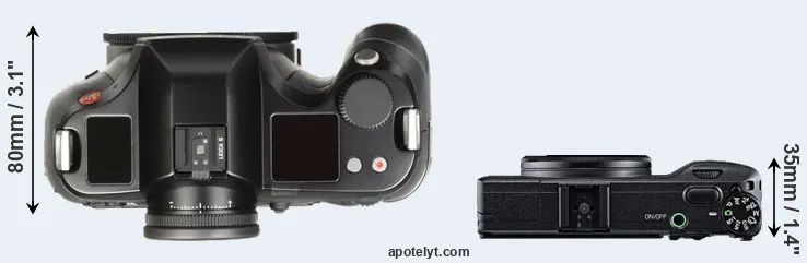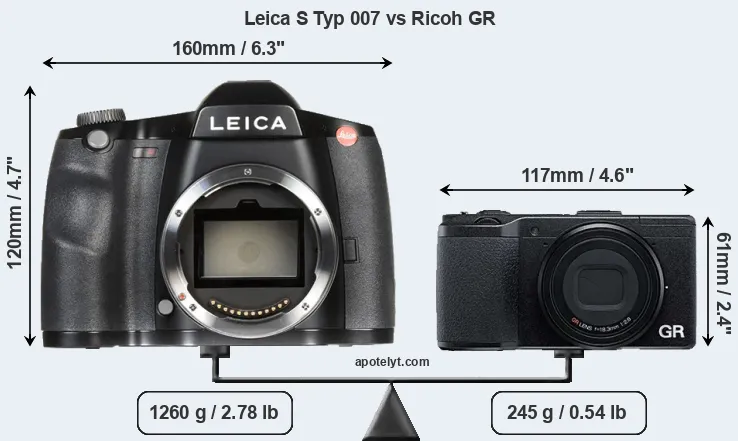 The physical size and weight of the Leica S Typ 007 and the Ricoh GR are illustrated in the side-by-side display below. The two cameras are presented according to their relative size. Three successive views from the front, the top, and the rear are shown. All width, height and depth dimensions are rounded to the nearest millimeter.