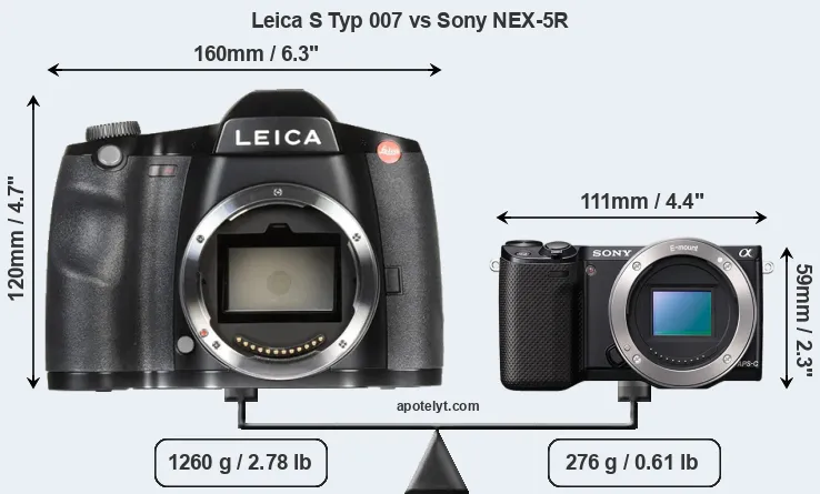 If the front view area (width x height) of the cameras is taken as an aggregate measure of their size, the Sony NEX-5R is considerably smaller (66 percent) than the Leica S Typ 007. Moreover, the NEX-5R is substantially lighter (78 percent) than the S Typ 007. It is worth mentioning in this context that the S Typ 007 is splash and dust resistant, while the NEX-5R does not feature any corresponding weather-sealing.