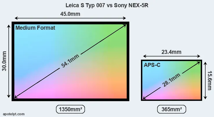 Of the two cameras under consideration, the Leica S Typ 007 features a medium format sensor and the Sony NEX-5R an APS-C sensor. The sensor area in the NEX-5R is 73 percent smaller. As a result of these sensor size differences, the cameras have a format factor of, respectively, 0.8 and 1.5. Both cameras have a native aspect ratio (sensor width to sensor height) of 3:2.
