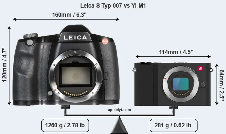 If the front view area (width x height) of the cameras is taken as an aggregate measure of their size, the YI M1 is considerably smaller (62 percent) than the Leica S Typ 007. Moreover, the M1 is substantially lighter (78 percent) than the S Typ 007. It is worth mentioning in this context that the S Typ 007 is splash and dust resistant, while the M1 does not feature any corresponding weather-sealing.