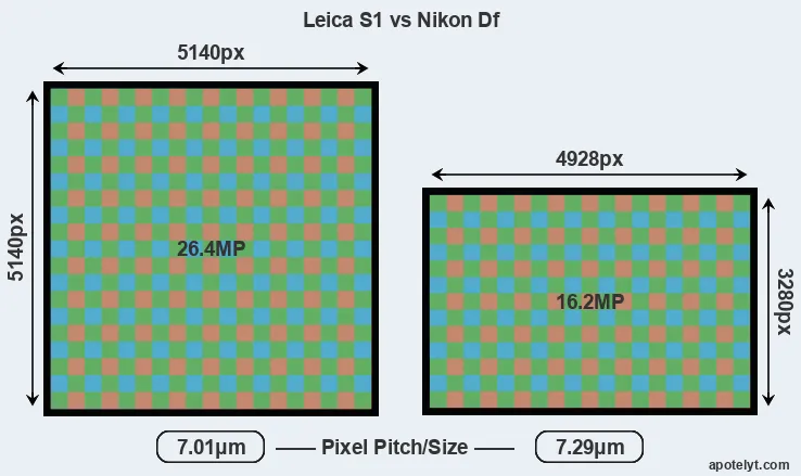 With 26.4MP, the S1 offers a higher resolution than the Df (16.2MP), but the S1 has smaller individual pixels (pixel pitch of 7.01μm versus 7.29μm for the Df). Moreover, the Df is a much more recent model (by 17 years and 2 months) than the S1, and its sensor will have benefitted from technological advances during this time that enhance the light gathering capacity of its pixels. Coming back to sensor resolution, it should be mentioned that the S1 has no anti-alias filter installed, so that it can capture all the detail its sensor resolves.