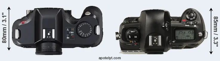 The side-by-side display below illustrates the physical size and weight of the Leica S2 and the Nikon D1. The two cameras are presented according to their relative size. Three successive views from the front, the top, and the rear are shown. All size dimensions are rounded to the nearest millimeter.