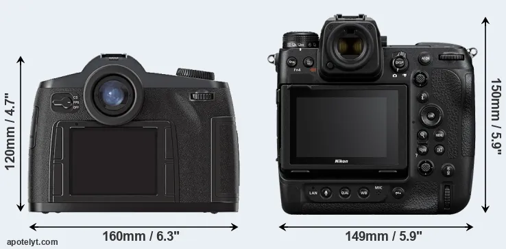 The side-by-side display below illustrates the physical size and weight of the Leica S2 and the Nikon Z9. The two cameras are presented according to their relative size. Three successive views from the front, the top, and the rear are shown. All width, height and depth measures are rounded to the nearest millimeter.