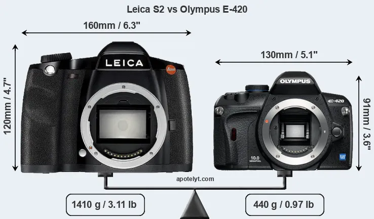 If the front view area (width x height) of the cameras is taken as an aggregate measure of their size, the Olympus E-420 is considerably smaller (38 percent) than the Leica S2. Moreover, the E-420 is substantially lighter (69 percent) than the S2. It is worth mentioning in this context that the S2 is splash and dust resistant, while the E-420 does not feature any corresponding weather-sealing.